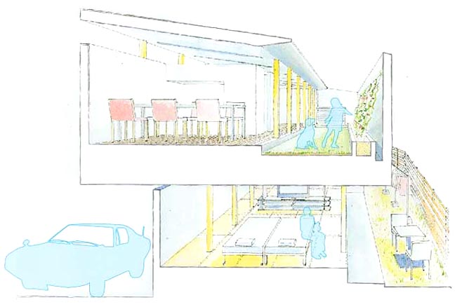 2階に持ち上げ、高い壁で周りの住宅街の風景を一掃した、箱庭庭園。 青空の下、緑の上でひなたぼっこに家庭菜園、キャッチボールにBBQ、人と自然、人と人のコミュニケーションの場となります。